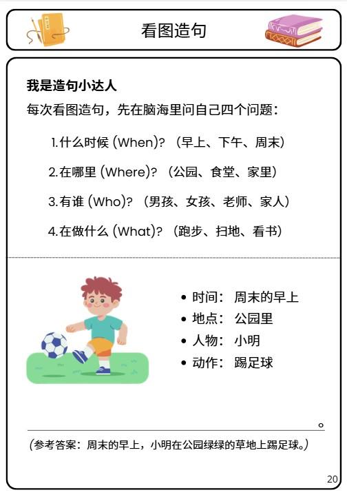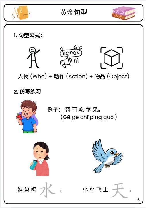 The “Golden Sentence Pattern”: Step-by-step guidance using the Person + Action + Object formula.